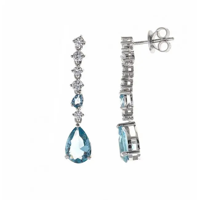 Pendientes largos espectaculares Salvatore plata. Pendientes Salvatore para mujer de la colección Legacy de diseño colgante fabricados en plata bañada en rodio compuestos por circonitas blancas y azul aguamarina en forma de pera. Su cierre es de presión. La medida de estos elegantes pendientes es de 3.5 cm. y son un complemento indispensable en tu ceremonia.